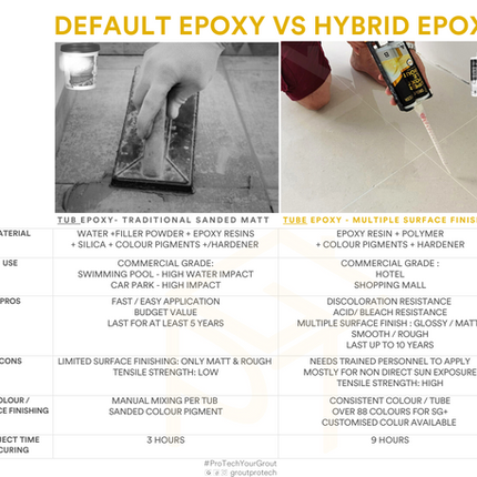 The term Epoxy Hybrid/ "Acrylic" grout is an upgraded version of Epoxy, containing a blend of two-component epoxy grout, made of high-tech polymer epoxy resin, hardener, high-grade pigments, and additives into epoxy, increasing its strength and durability. It does not require manual mixing, unlike the tub form you often see, hence making it consistent with every tube.